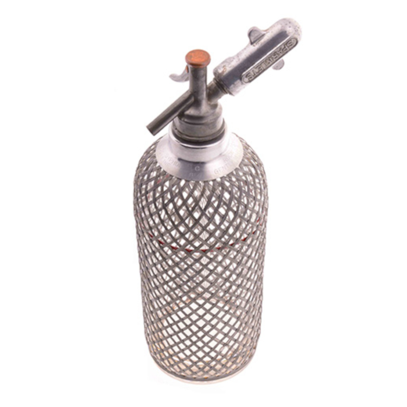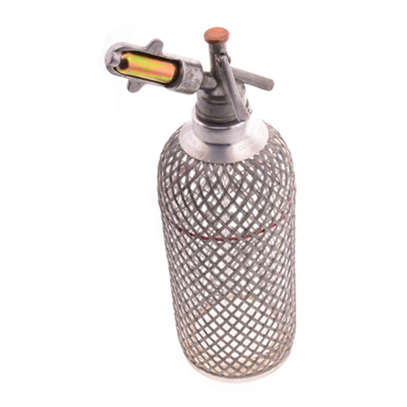 Bei dem Soda Siphon handelt es sich um den sogenannten C-Type (d.h. charakterisch für die 1920er Modelle bleibt der Kapselhalter während des Betriebs auf dem Soda Siphon). Die mundgeblasene Glasflasche mit Drahtgeflecht wurde in der Tschechoslowakei zwischen 1920 und 1930 gefertigt.