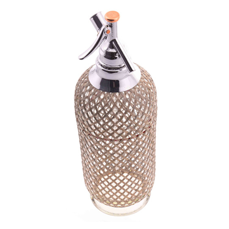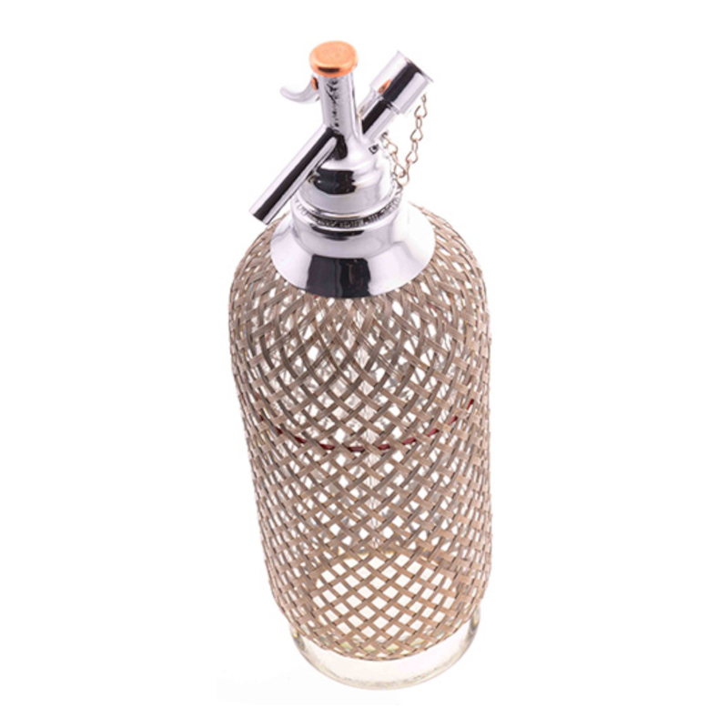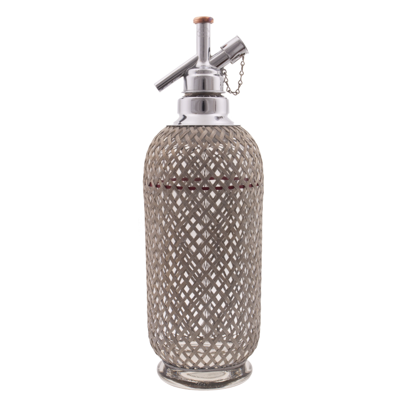 Bei diesem Soda Siphon handelt es sich um den sogenannten D-Type. Dieser ist eine technische Weiterentwicklung des C-Type-Modells der 1920er Jahre. Neu ist das Rückschlagventil, das es ermöglicht, dass der Kapselhalter während des Betriebs entfernt werden kann. Die mundgeblasene Glasflasche mit korrosionsbeständigerem Drahtgeflecht wurde in der Tschechoslowakei zwischen 1930 und 1940 gefertigt.